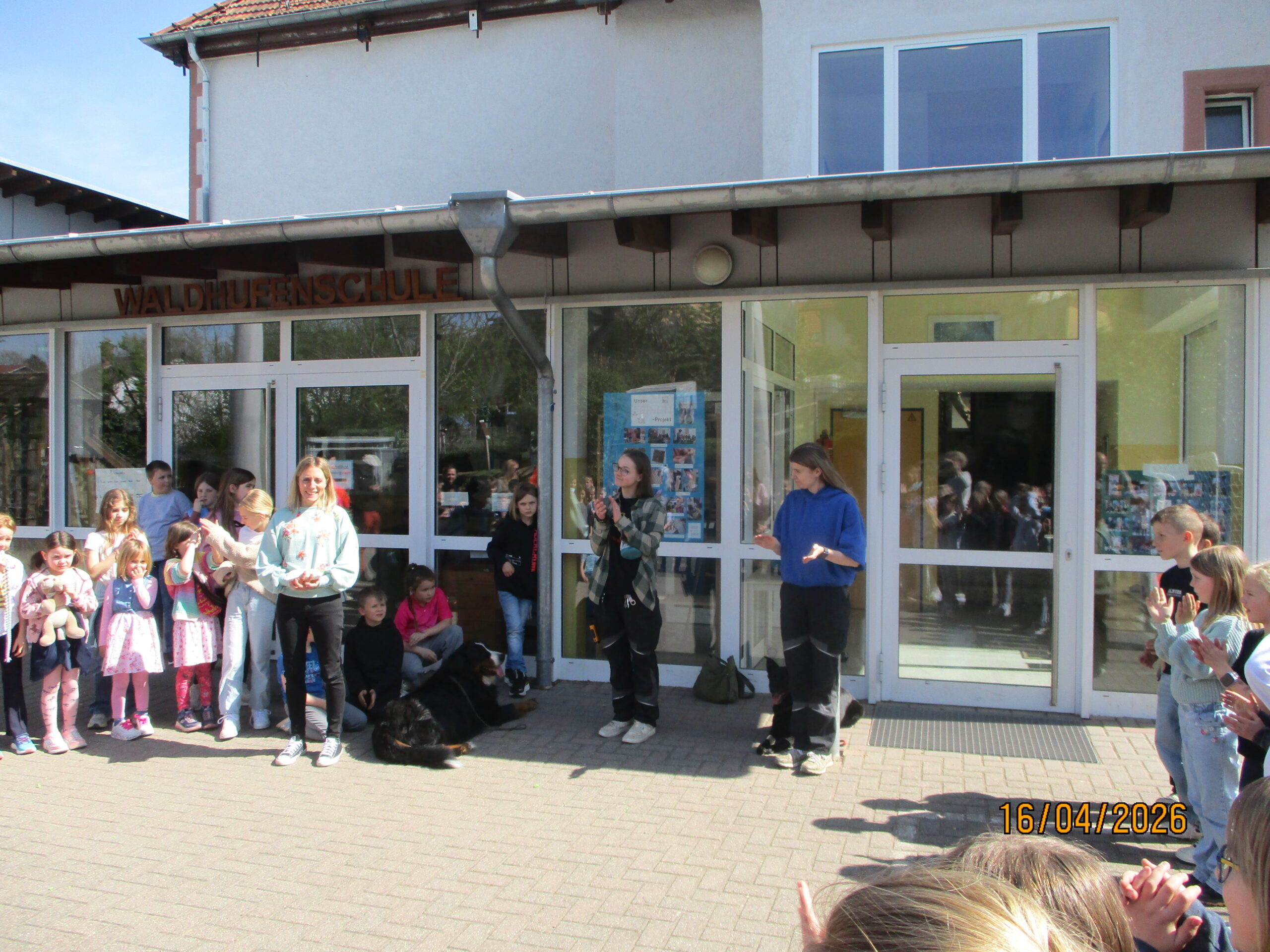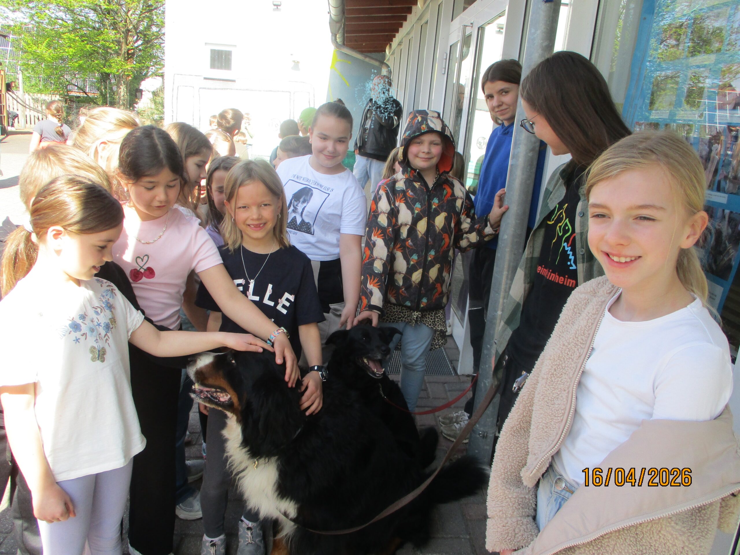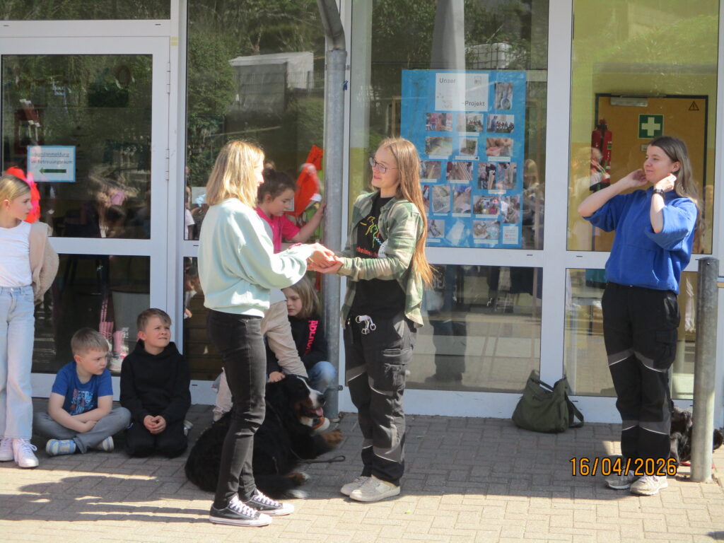 Gestern, am 16. April 2026, kamen Luisa und Nele vom Tierheim in Begleitung der Hunde Ayka und Casanova zu uns an die Schule, um den prall gefüllten Spendengeldbeutel mit dem „Notgroschen für alle Felle“ entgegenzunehmen. Die beiden Frauen waren sichtlich gerührt und erfreut über diesen Betrag und bedankten sich herzlich.