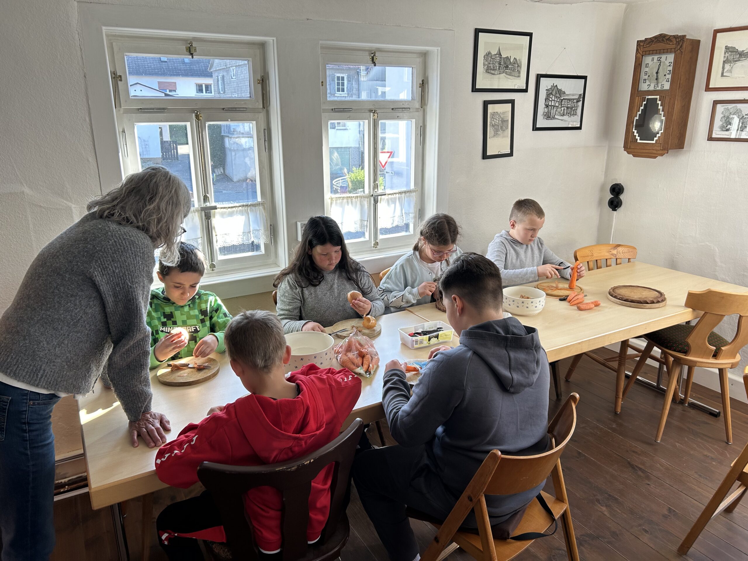 Die Klasse wurde in drei Gruppen aufgeteilt. Jede Gruppe wechselte sich ab, sodass jeder einmal beim Schneiden des Gemüses und Obst helfen konnte und durch das Museum geführt wurde.