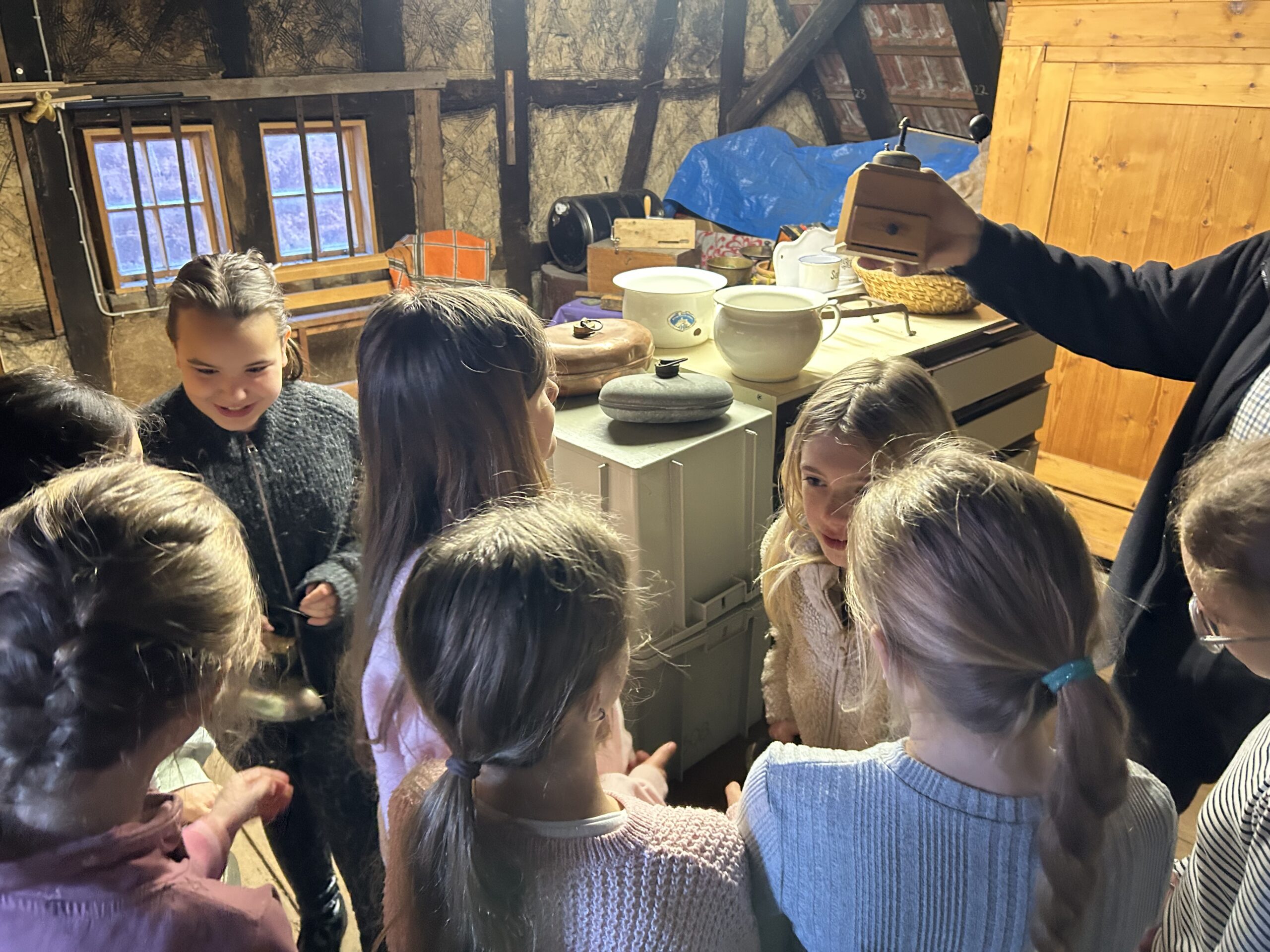 Die Klasse 4 der Waldhufenschule lief am Mittwoch den 15.04. gemeinsam mit ihrer Klassenlehrerin Frau Bauer und einer Praktikantin zum Roten Haus, dem Heimatmuseum in Zotzenbach. Um 9:00 Uhr wurde die Klasse von Herrn Beil und fünf weiteren Mitgliedern des Heimat- und Museumsvereins Zotzenbach begrüßt.