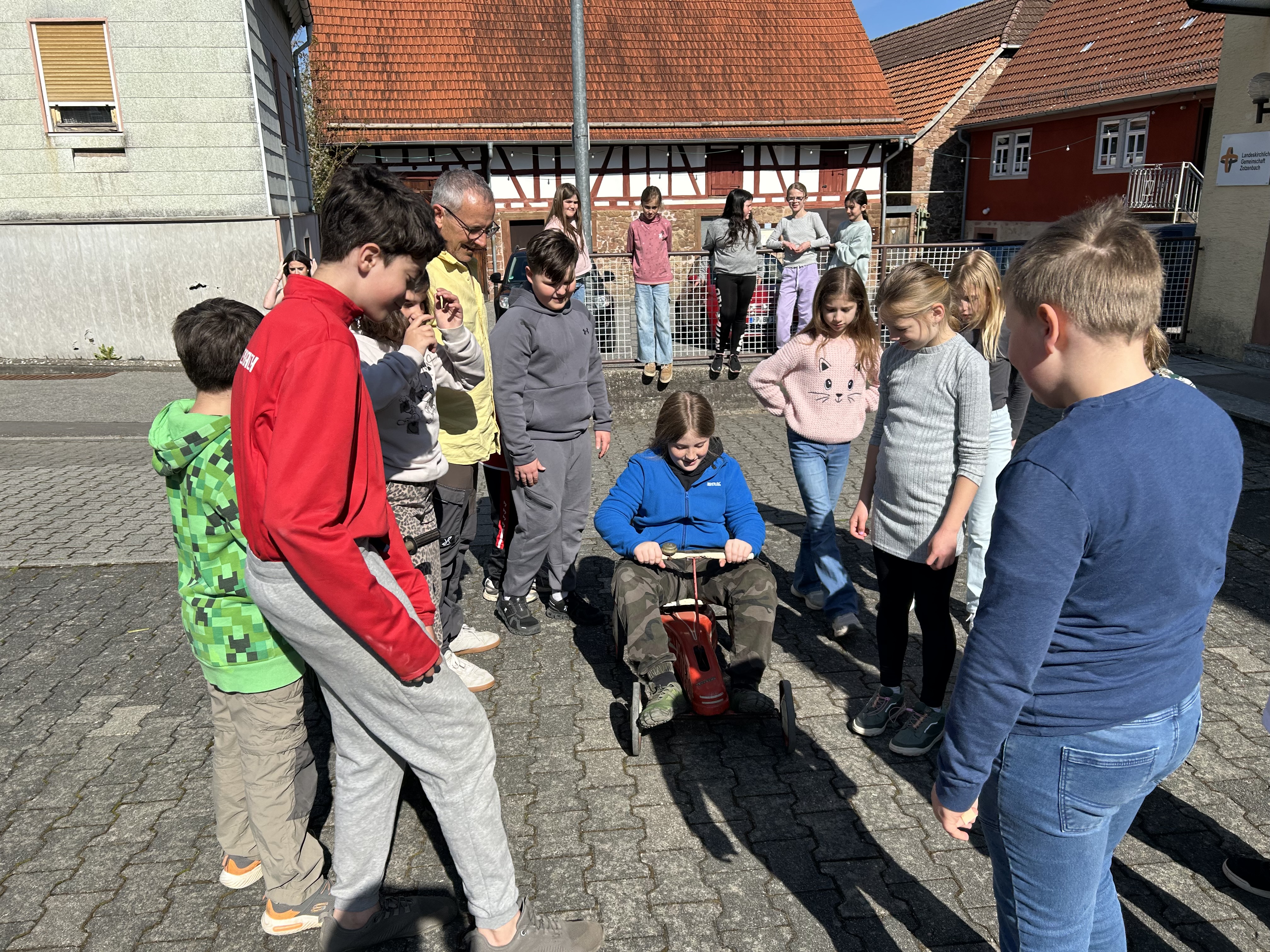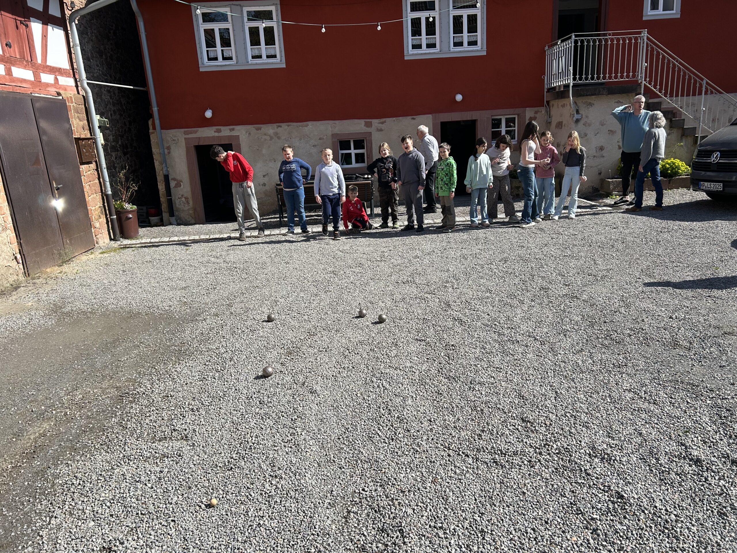 Während die Kinder auf das Essen warteten, probierten sie alte Spiele und Fahrzeuge aus. Ein Fahrzeug kostet über 1000 Euro, erfuhren die Kinder von Herrn Kühnle. Er zeigte der Klasse außerdem das Spiel Boule und ein Holzspiel.