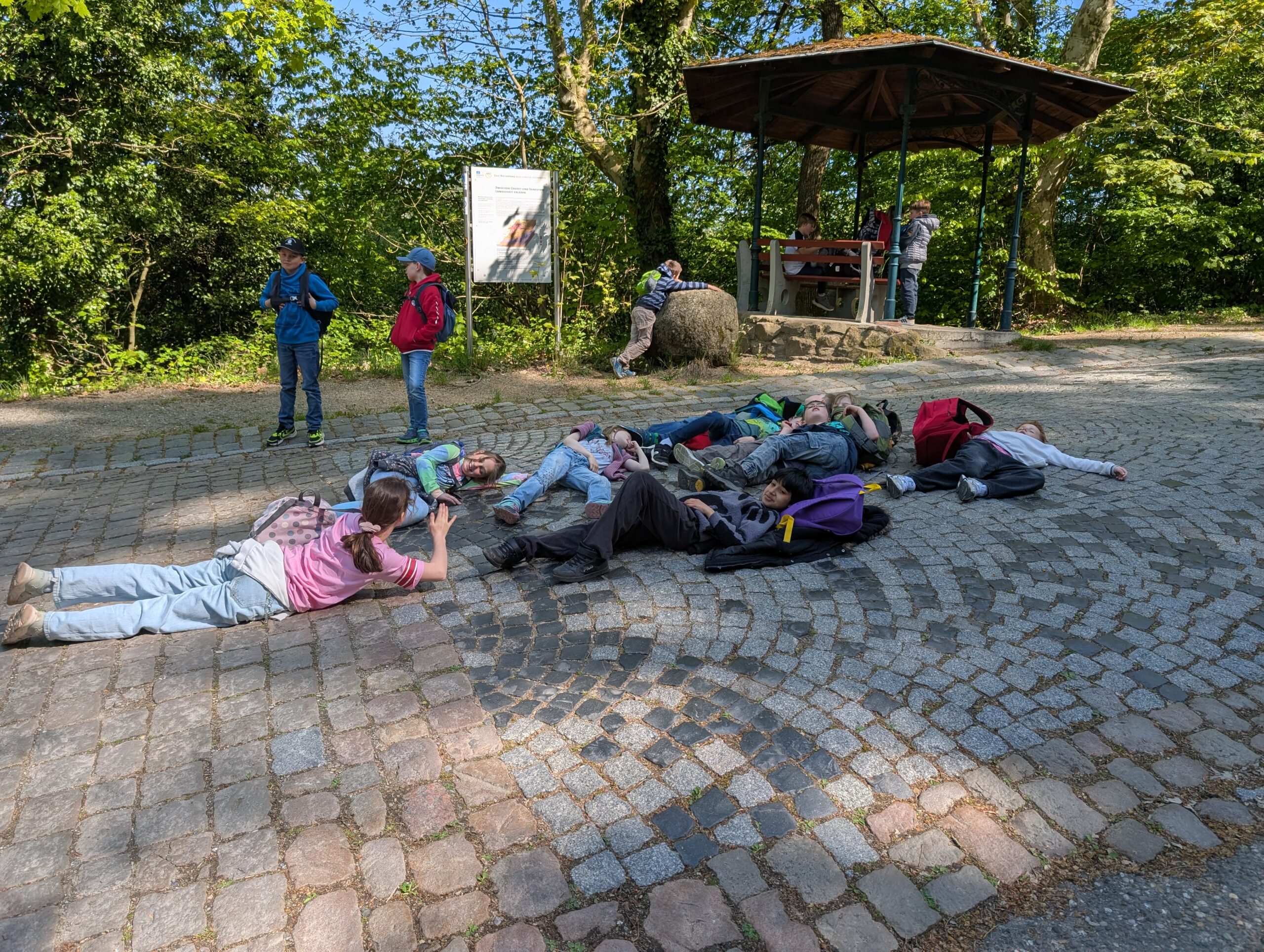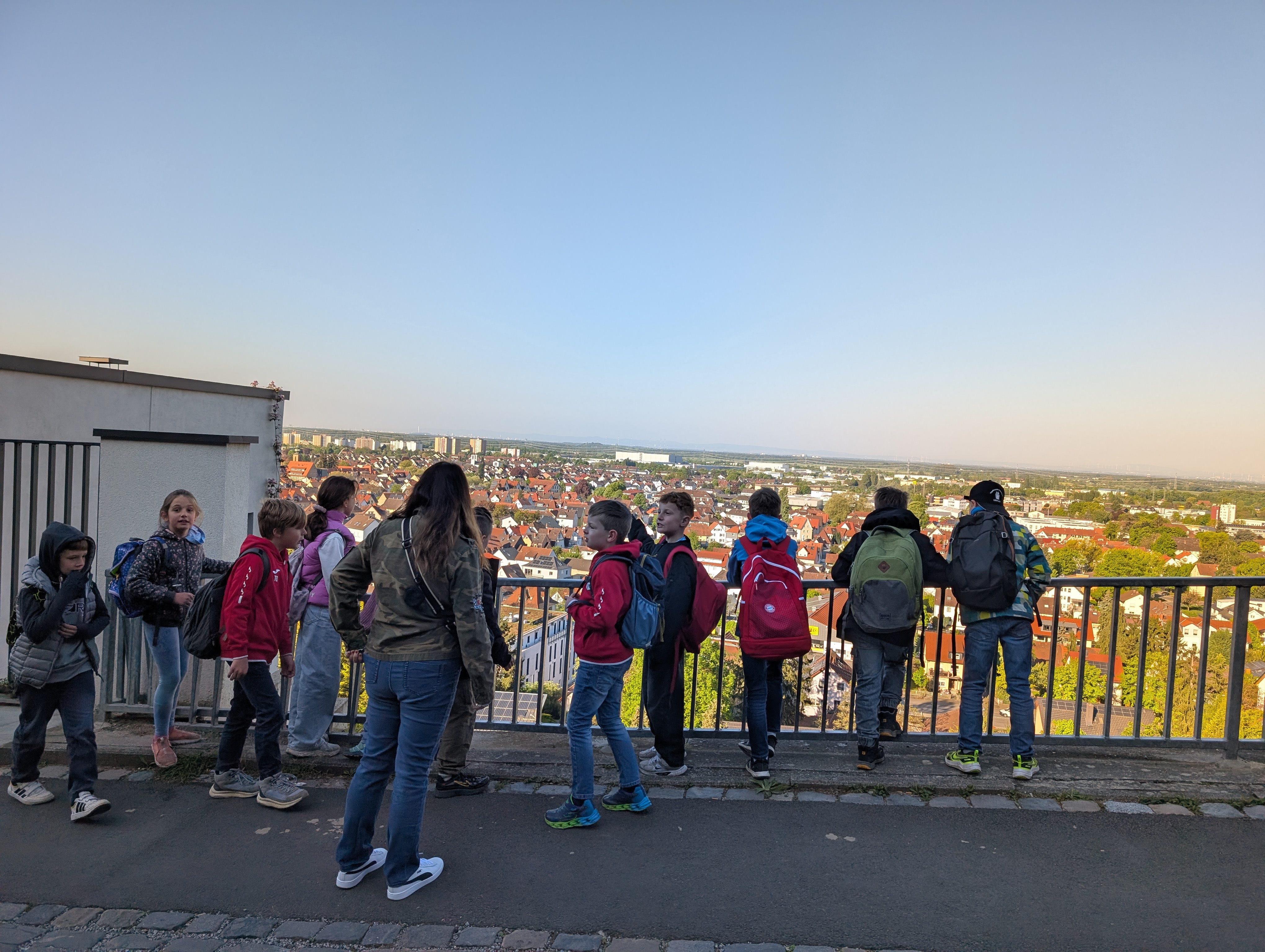 Mit dem öffentlichen Bus fuhr die Klasse nach Heppenheim und legte von dort den Weg zur Sternwarte zu Fuß zurück. Bevor es losging, blieb noch etwas Zeit für ein Frühstück und Toben auf dem Spielplatz.