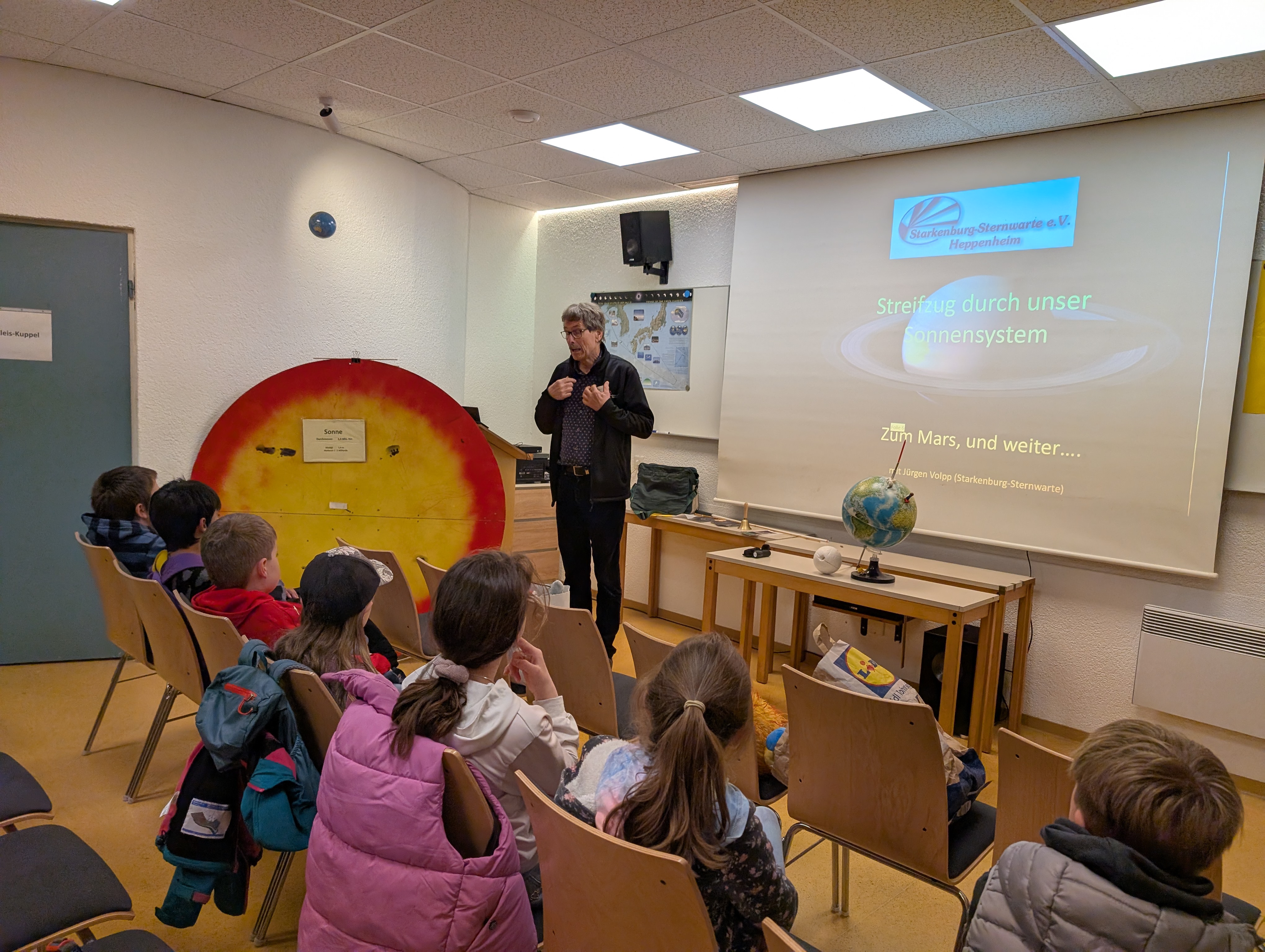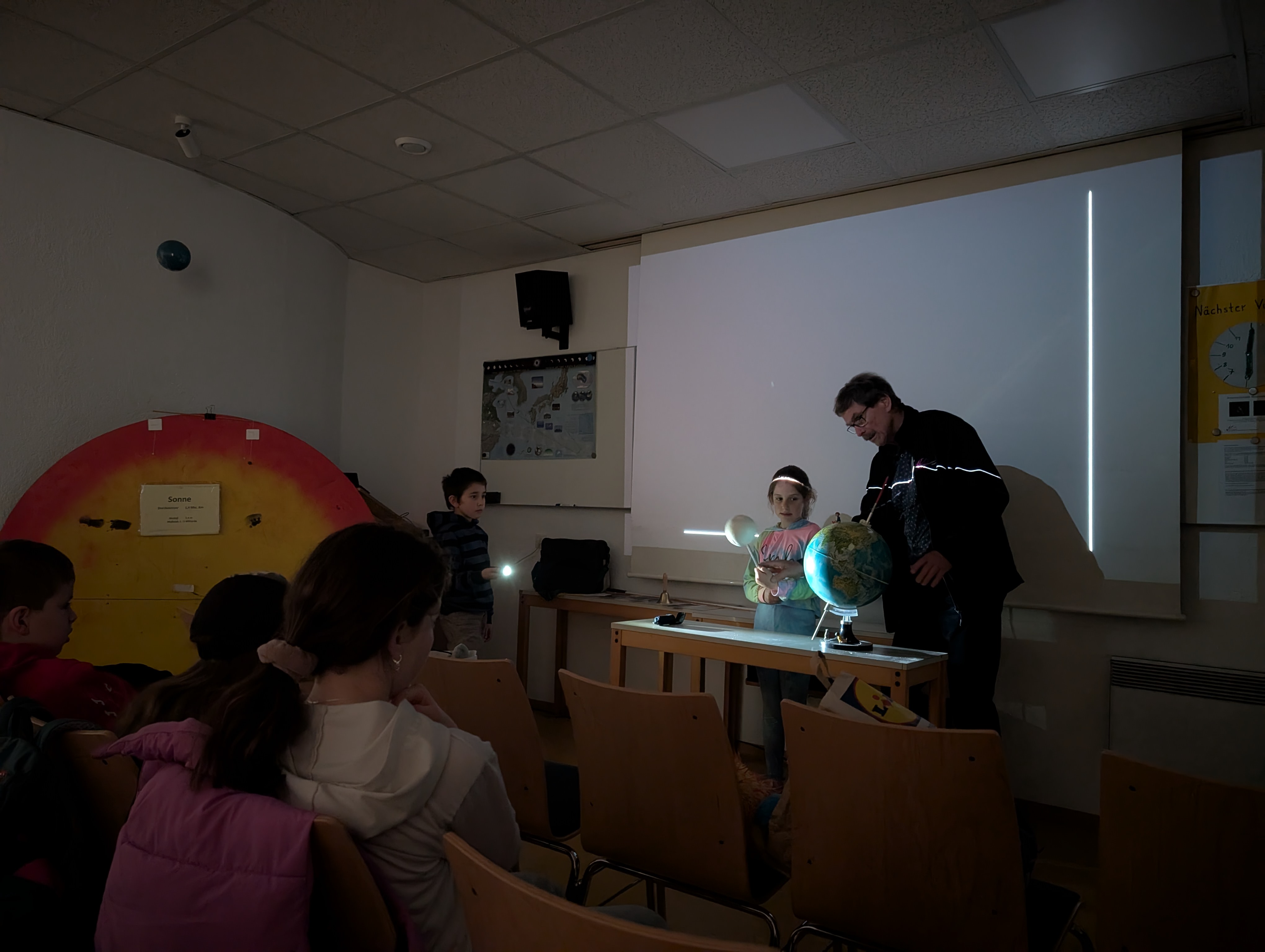 In der Sternwarte erklärte und demonstrierte Herr Volpp unter anderem wie eine Mond- oder Sonnenfinsternis entsteht, die Ursache der Jahreszeiten und einige Fakten zu verschiedenen Planeten.